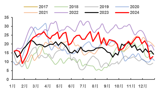 为何今年涤丝的去库节奏如此迅猛?事实上,涤丝销售的“脉冲化”已经是近几年的常态现象了。在经历了2020-2021年外需推动下的市场火爆格局后,随着需求端转向温和与原料价格的持续走弱,整个聚酯产业链下游市场趋于理性,“买涨不买跌”的投机情绪在逐步滑落。特别是进入2024年后,大部分时间里下游选择在低价节点进行集中备货,而在原料价格止跌上涨后就逐渐停止。在目前涤丝价格纷纷来到3年低点的情况下,下游开展集中备货的积极性自然也得到催动。另一方面,今年在国内外政策等因素的扰动下,秋冬旺季需求的落地晚了一些,导致2024年聚酯下游整体的运行节奏相对偏慢;与此同时,2025年的春节时间较早,节前放假也自然提前,这样留给下游备货的时间窗口其实是很短的。因此,“时间紧,任务重”,下游工厂的备货节奏也就不可避免更加迅速。