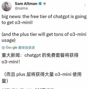 1月24日,ChatGPT创始人的创始人山姆·奥特曼突然宣布,将原来每个月200美元订阅价格的ChatGPT O3Mini版本直接免费了,而PLUS版本也将拥有大量O3Mini使用量。