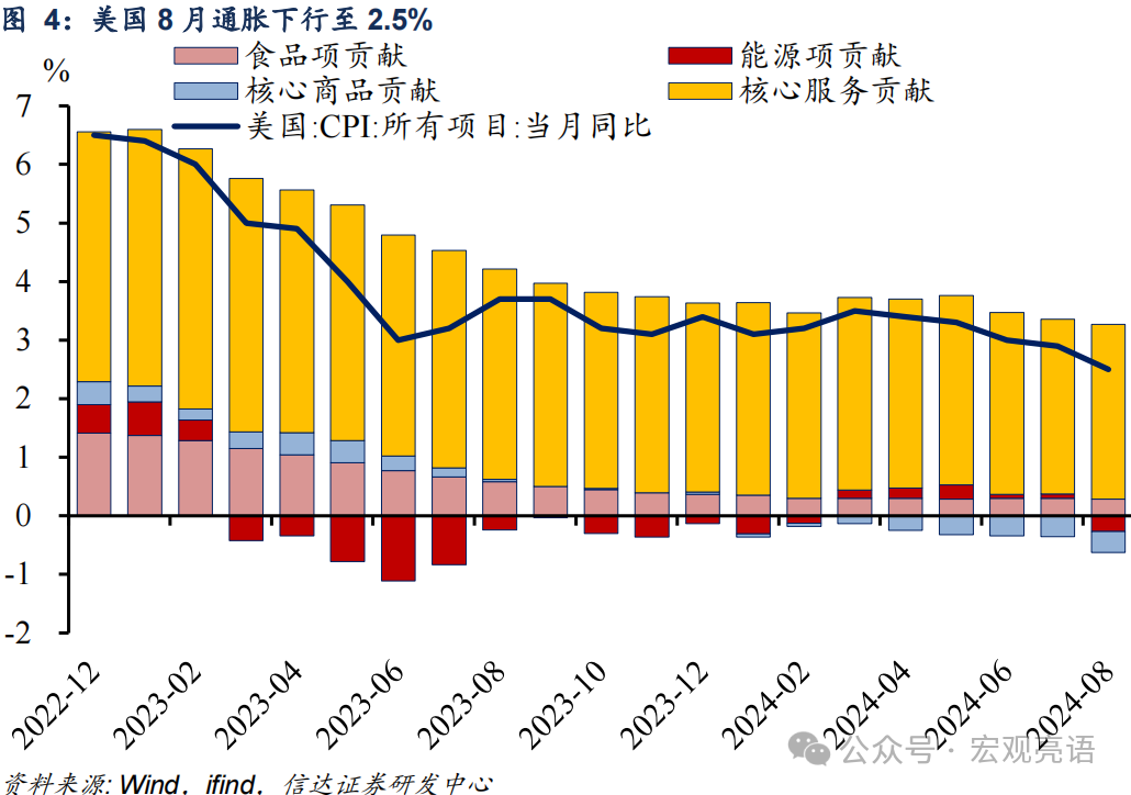2)8月美国CPI涨幅继续回落,下降低至2.5%,但是海外市场对通胀下降的反应并不算热烈,通胀数据发布后CME仍旧预期降息25bp。究其原因,是8月核心通胀和7月持平,8月通胀回落主要是能源项引起的波动。