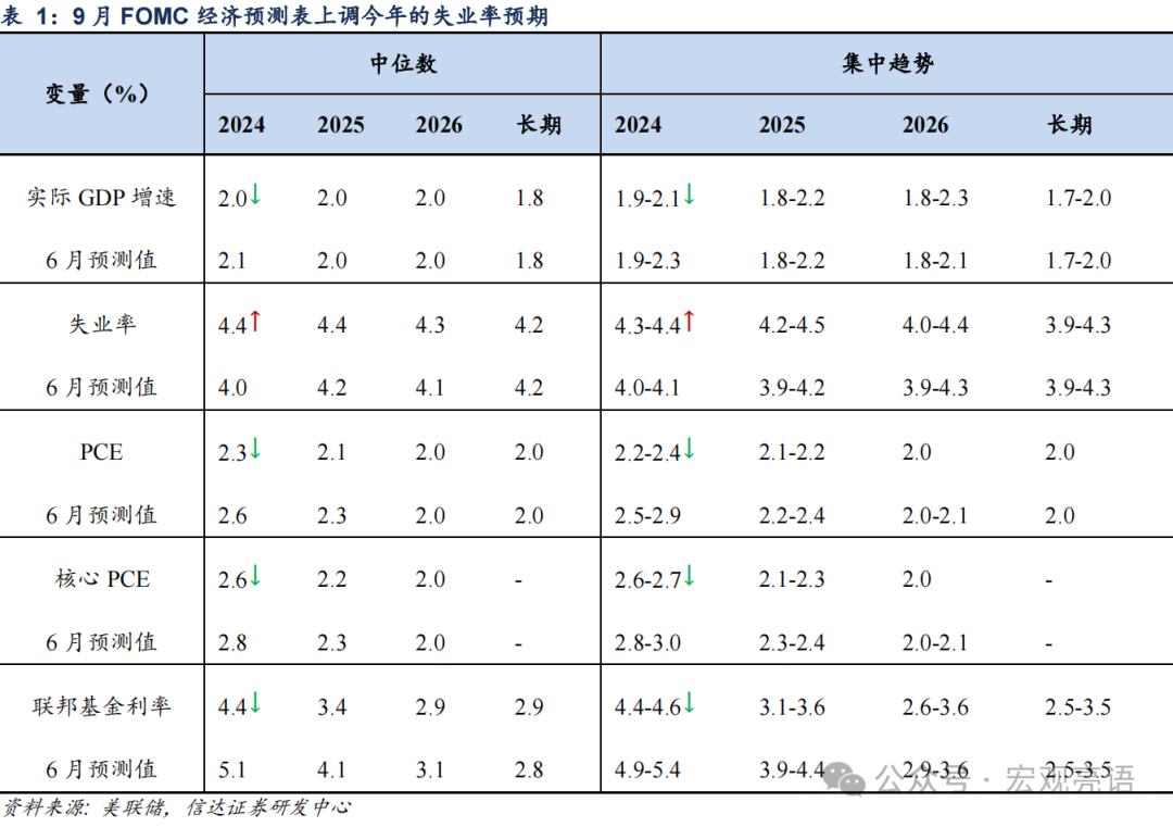 1)在9月经济预测上,美联储下调了经济增速、PCE和核心PCE的预期,但上调了失业率的预期(见表1),不难看出就业市场的趋软已经引起了美联储的关注(见表2)。不仅如此,美联储主席鲍威尔表示,如果当时有就业数据,美联储很可能会在7月份就降息,这反映出当前美联储的政策决策重点已经从通胀转向就业。