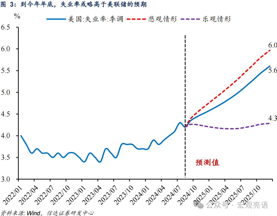 在此情形下,2024年底和2025年底失业率分别为4.3%和5.6%左右。和9月经济预测失业率相比,仅略高于2024年底(4.4%)0.1个百分点。在失业率接近美联储预期的情况下,后续出现“25bp-50bp”降息路径的可能性不大。