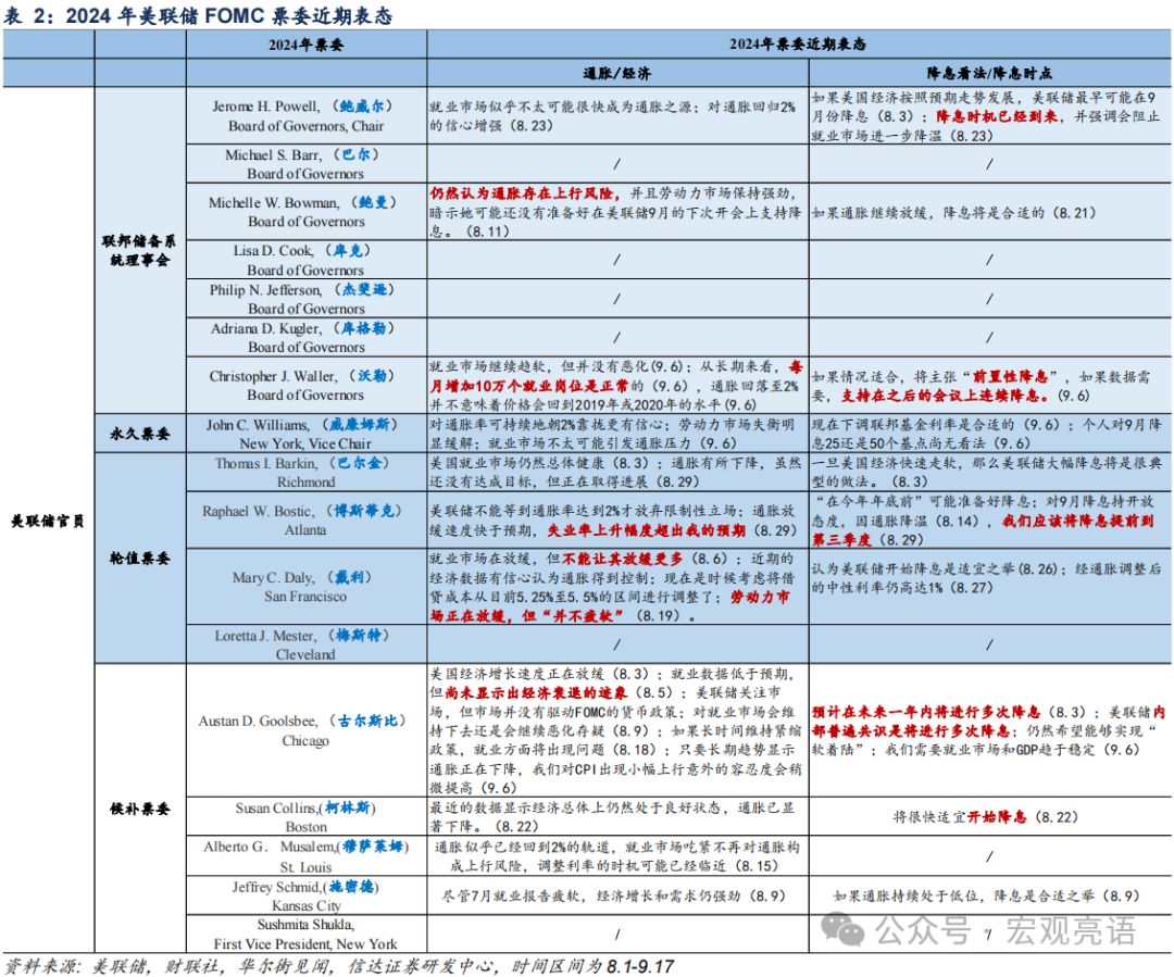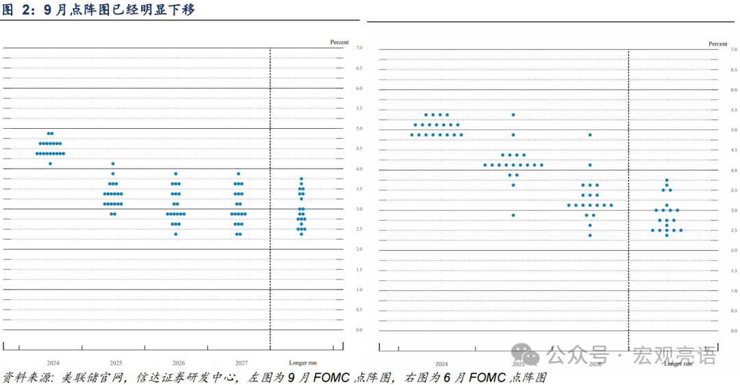 不仅如此,8月核心通胀较7月略有反弹,在此背景下,9月降息幅度仍打破了往常25bp的降息节奏,我们认为背后体现的是通胀权重或有下降,侧重点或正从通胀转向就业。